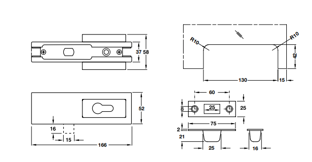 Trọn bộ gồm: 1 kẹp kính trên, 2 vít lục giác SW 2 và 5, 2 miếng đệm cho kính dày 10 mm